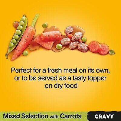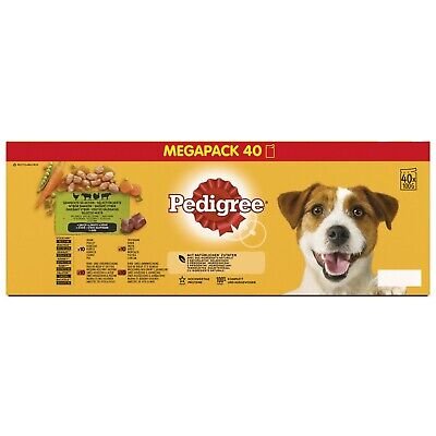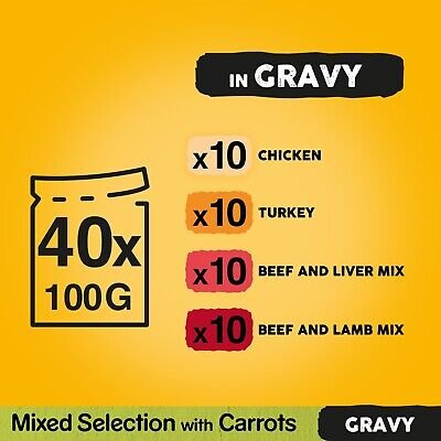 • 40 x 100g Pedigree wet dog food pouches in gravy with chicken & vegetables, beef & vegetables, turkey & carrots and beef & lamb for adult dogs with no artificial colorants, flavours or preservatives.