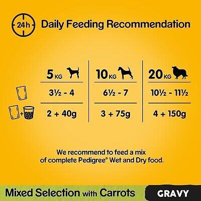 24h Daily Recommendation Pouch Only: 5 kg: 3 1/2 – 4, 10 kg: 6 1/2 – 7, 20 kg: 10 1/2 – 11 1/2 Pouch + Dry Food: 5 kg: 2 + 40g, 10 kg: 3 + 75 g, 20 kg: 4 + 150 g 1 pouch can be replaced by 23 g Pedigree® dry food. 85 kcal/100 g Feeding instructions: Adjust the amount of food according to the age, size and activity level of your dog. Serve food at room temperature, surplus food can be chilled for up to 2 days. Fresh water should always be available. Perfect for a fresh meal on its own, or to be served as a tasty topper on dry food. Simply unzip the pouch and serve immediately.