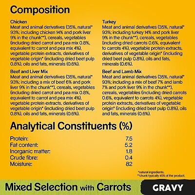 • This wet dog food in gravy contains no artificial colours, flavours or preservatives