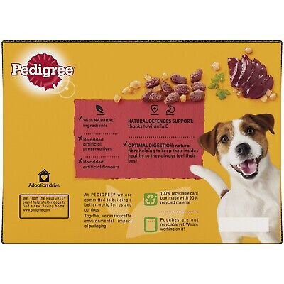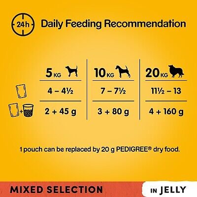24h Daily Feeding Recommendation Pouch Only: 5 kg: 4 – 4 1/2, 10 kg: 7 – 7 1/2, 20 kg: 11 1/2 – 13 Pouch + Dry Food: 5 kg: 2 + 45 g, 10 kg: 3 + 80 g, 20 kg: 4 + 160 g 1 pouch can be replaced by 20 g Pedigree® dry food. 79 kcal/100 g Feeding instructions: Feeding amounts are intended as guidelines only. Adjust the amount of food according to the age, size and activity level of your dog. Account for the calories coming from treats. Visit our website or call our consumer careline for feeding information. Serve food at room temperature, surplus food can be chilled for up to 2 days. Fresh water should always be available. Perfect for a fresh meals on its own, or to be served as a tasty topper on dry food. Simply unzip the pouch and serve immediately.