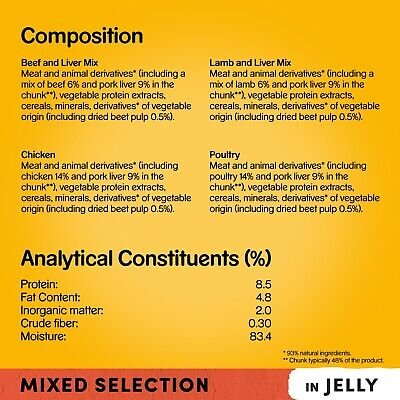 Beef and Liver Mix Meat and Animal Derivatives^ (including a Mix of Beef 5% and Pork Liver 9% in the Chunk**), Vegetable Protein Extracts, Cereals, Minerals, Derivatives of Vegetable Origin (including Dried Beet Pulp 0.5%) , ^Of which 93% Natural, **Chunk typically 48% of the product Chicken Meat and Animal Derivatives^ (including a Chicken 14% and Pork Liver 9% in the Chunk**), Vegetable Protein Extracts, Cereals, Minerals, Derivatives of Vegetable Origin (including Dried Beet Pulp 0.5%), ^Of which 93% Natural, **Chunk typically 48% of the product Lamnb and Liver Mix Meat and Animal Derivatives^ (including a Mix of Lamb 6% and Pork Liver 9% in the Chunk**), Vegetable Protein Extracts, Cereals, Minerals, Derivatives of Vegetable Origin (including Dried Beet Pulp 0.5%), ^Of which 93% Natural, **Chunk typically 48% of the product Poultry Meat and Animal Derivatives^ (including Poultry 14% and Pork Liver 9% in the Chunk**), Vegetable Protein Extracts, Cereals, Minerals, Derivatives of Vegetable Origin (including Dried Beet Pulp 0.5%), ^Of which 93% Natural, **Chunk typically 48% of the product