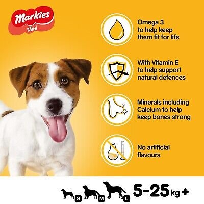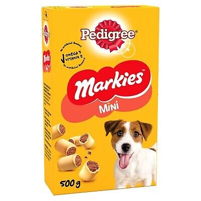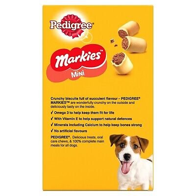 • Markies tasty dog biscuits are available in different flavours, in Standard size and in Minis. Help keep your dog exuberant with Markies dog treats; part of the Pedigree dog treats range.