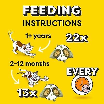For adult cats, feed up to 22 pieces per day. For kittens of 2 kg and above, feed up to 13 pieces per day. Please reduce main meal accordingly. Fresh drinking water should always be available.
