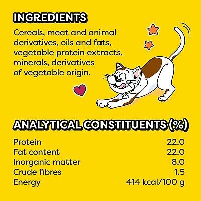 Additives per kg:: Antioxidants and Colourants;, Nutritional additives:, Vitamin A:: 1293 IU, Vitamin Bâ‚:: 9.9 mg, Vitamin Bâ‚‚:: 16.9 mg, Vitamin B₆:: 4.4 mg, Vitamin D₃:: 143 IU, Vitamin E:: 115 mg, Copper (Copper(II) sulphate pentahydrate):: 6.1 mg, Iodine (Potassium iodide):: 1.5 mg, Manganese (Manganous sulphate, monohydrate: 14.1 mg, Zinc (Zinc sulphate, monohydrate):: 70.5 mg, Sensory additives:, Chicken flavour:: 4.1 mg, Catnip Flavour:: 11.1 mg, Duck Flavour:: 1.4 mg