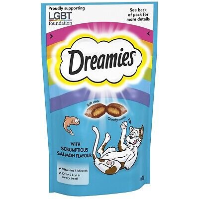 DREAMIES cat treats are packed full of things cats love. Share moments with your feline friend with these dual-texture treats with an enticingly crunchy outside and a soft inside. DREAMIES with Scrumptious Salmon flavour contains vitamins and minerals, at just 2 calories per treat. So go on, give the bag a shake and watch your cat come running!