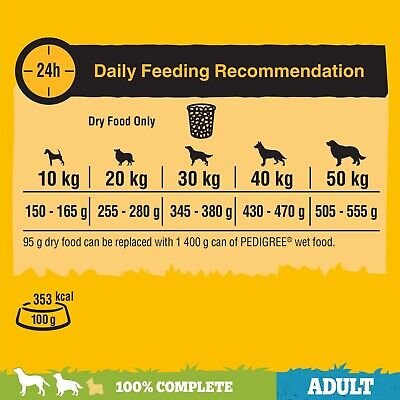 24h Daily Feeding Recommendation Dry Food Only: 10 kg: 150 – 165 g, 20 kg: 255 – 280 g, 30 kg: 345 – 380 g, 40 kg: 430 – 470 g, 50 kg: 505 – 555 g 90 g dry food can be replace with 1 400 g can of Pedigree® wet food. 353 kcal/100 g Feeding instructions: Account for the calories coming from treats. Feeding amounts are intended as guidelines only. Adjust the amount of food according to the age, size and activity level of your dog. Please introduce food gradually when switching diets. For more detailed information, please visit our website. Fresh water should always be available.