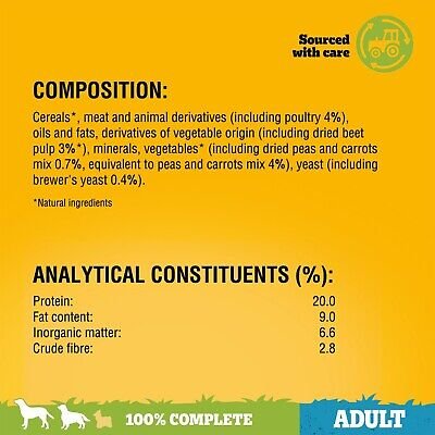 Cereals*, Meat and Animal Derivatives (including Poultry 4%), Oils and Fats, Derivatives of Vegetable Origin (including Dried Beet Pulp 3%*), Minerals, Vegetables* (including Dried Peas and Carrots Mix 0.7%, equivalent to Peas and Carrots Mix 4%), Yeast (including Brewer’s Yeast 0.4%), *Natural ingredients
