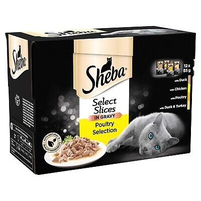 • Delicious Sheba cat food in gravy with Duck, Chicken, Poultry and Duck & Turkey is made from select ingredients.
