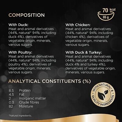 With Duck Analytical constituents (%):: Protein:: 8.5, Fat content:: 4.5, Inorganic matter:: 2.0, Crude fibre:: 0.30, Moisture:: 82.0, Additives per kg:, Nutritional additives:, Vitamin D3:: 213 IU, Taurine:: 572 mg, Copper (Copper(II) sulphate pentahydrate):: 1.3 mg, Iodine (Calcium iodate, anhydrous):: 0.34 mg, Iron (Iron(II) sulphate monohydrate):: 17.0 mg, Manganese (Manganous sulphate, monohydrate):: 3.4 mg, Zinc (Zinc sulphate, monohydrate):: 16.0 mg With Chicken Analytical constituents (%):: Protein:: 8.5, Fat content:: 4.5, Inorganic matter:: 2.0, Crude fibre:: 0.30, Moisture:: 82.0, Additives per kg:, Nutritional additives:, Vitamin D3:: 213 IU, Taurine:: 572 mg, Copper (Copper(II) sulphate pentahydrate):: 1.3 mg, Iodine (Calcium iodate, anhydrous):: 0.34 mg, Iron (Iron(II) sulphate monohydrate):: 17.0 mg, Manganese (Manganous sulphate, monohydrate):: 3.4 mg, Zinc (Zinc sulphate, monohydrate):: 16.0 mg With Poultry Analytical constituents (%):: Protein:: 8.5, Fat content:: 4.5, Inorganic matter:: 2.0, Crude fibre:: 0.30, Moisture:: 82.0, Additives per kg:, Nutritional additives:, Vitamin D3:: 213 IU, Taurine:: 572 mg, Copper (Copper(II) sulphate pentahydrate):: 1.3 mg, Iodine (Calcium iodate, anhydrous):: 0.34 mg, Iron (Iron(II) sulphate monohydrate):: 17.0 mg, Manganese (Manganous sulphate, monohydrate):: 3.4 mg, Zinc (Zinc sulphate, monohydrate):: 16.0 mg With Duck and Turkey Analytical constituents (%):: Protein:: 8.5, Fat content:: 4.5, Inorganic matter:: 2.0, Crude fibre:: 0.30, Moisture:: 82.0, Additives per kg:, Nutritional additives:, Vitamin D3:: 213 IU, Taurine:: 572 mg, Copper (Copper(II) sulphate pentahydrate):: 1.3 mg, Iodine (Calcium iodate, anhydrous):: 0.34 mg, Iron (Iron(II) sulphate monohydrate):: 17.0 mg, Manganese (Manganous sulphate, monohydrate):: 3.4 mg, Zinc (Zinc sulphate, monohydrate):: 16.0 mg